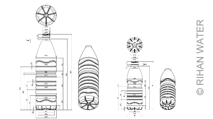 The shape of the bottle is a unique design that is made with the least amount of material for economic aspects and environmental protection. It is made using a Chinese blowing and pressing machine. After consumption, it can be easily compressed from above and below even by hand, to take up little space and be sisposed in selective containers for recycling.